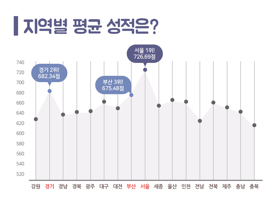 불변의 1위 '서울'이 이번에도 지역별 평균 성적 1위 자리를 지켰는데요. 아쉽게도 점수로는 저번 회차보다 4.82점 하락한 726.69점을 기록하였습니다. 2, 3위 지역도 저번 회차와 동일한데요. '경기'가 682.34점으로 2위, '부산'이 675.48점으로 3위를 차지했습니다. 지난 회차에 비해 2위는 15.55점, 3위는 7.83점 하락한 것을 확인할 수 있습니다.