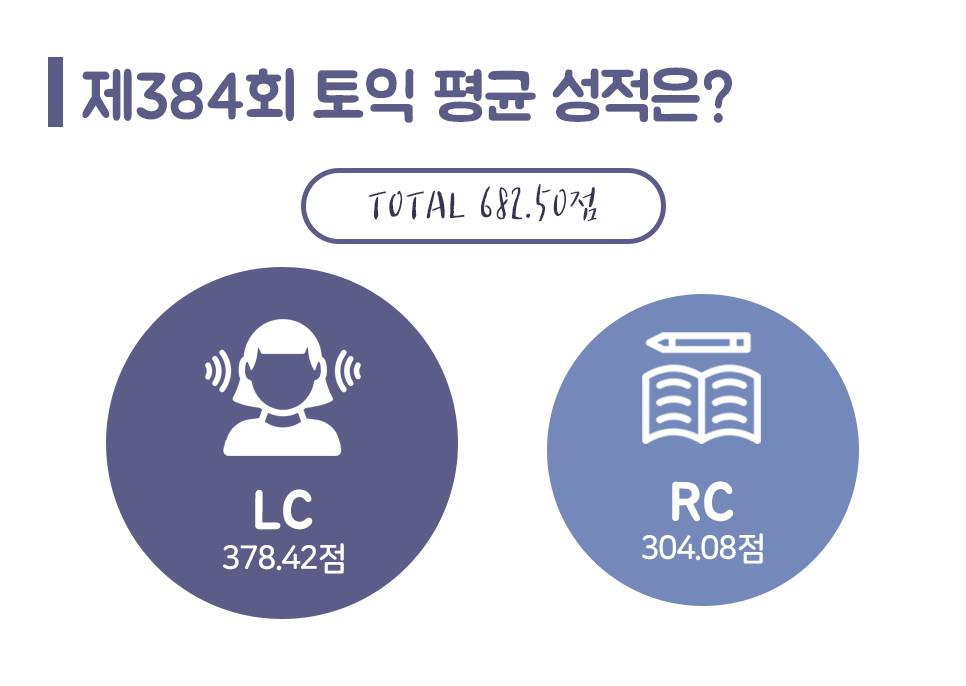 384회 평균 성적은 682.50점으로 지난 7월 14일 시험보다 9.95점 하락하였는데요. 부문별로 보면 LC 평균 점수는 378.42점, RC는 304.08점으로 지난 383회보다 각각 3.91점, 6.05점 하락했습니다.