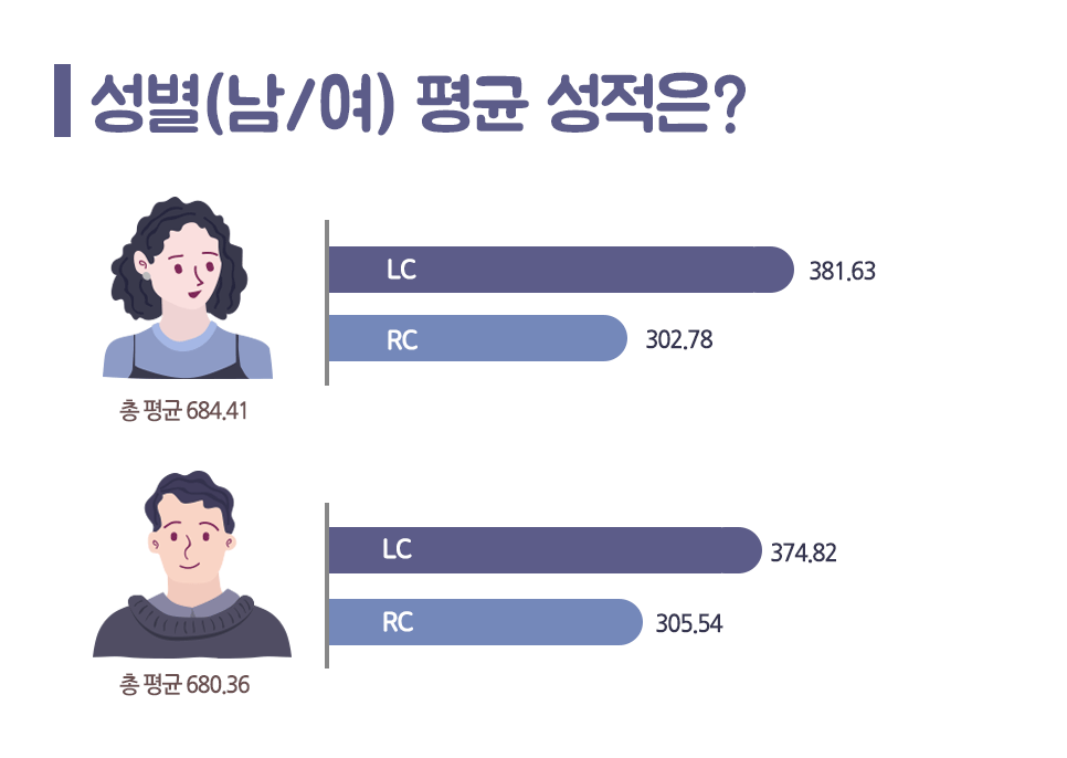 384회 토익에서 여성의 평균 성적은 684.41점으로 지난 회차보다 12.78점, 남성의 평균 성적은 680.36점으로 7.1점 떨어졌습니다. 남녀의 평균 성적 차이는 4.05점을 기록하며 저번 회차보다 5.68점 격차를 줄었네요!