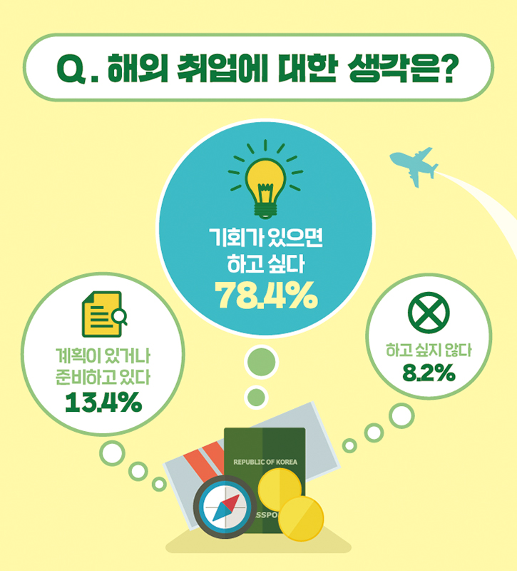 지금까지 ‘해외 취업, 어떻게 생각하시나요?’ 설문조사 결과를 함께 확인해보았습니다.취준생들이 해외 취업에 대해 전반적으로 긍정적인 생각을 가지고 있는 것을 알 수 있었는데요. 해외에서도 활약할 미래의 주역들을 <토익스토리>가 항상 응원합니다~! :D