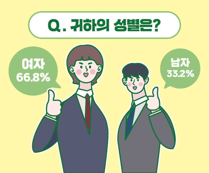 이번 설문조사에는 여자가 66.8%, 남자가 33.2% 참여했는데요. 여성이 약 2배가량 많이 참여했네요!