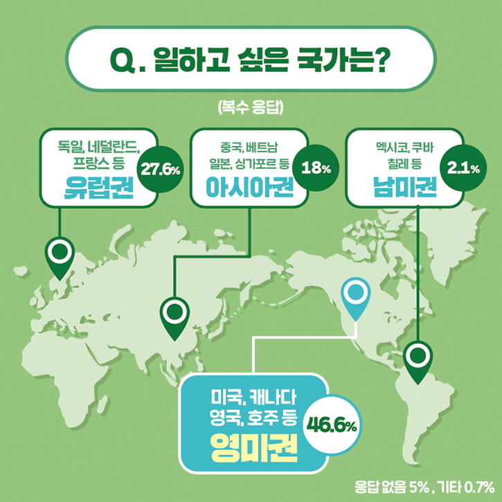 일하고 싶은 국가 1위는 어디일까요~? 설문조사 결과, 미국, 캐나다, 영국, 호주 등 '영미권'이 46.6%로 가장 높았습니다. 영어를 모국어로 사용하는 국가들이다 보니 취업도 하고 영어 실력을 키울 수 있어 선호하는 것으로 추측되는데요. 이어 '유럽권'(27.6%), '아시아권'(18%), '남미권'(2.1%) 순으로 비율이 높았습니다.