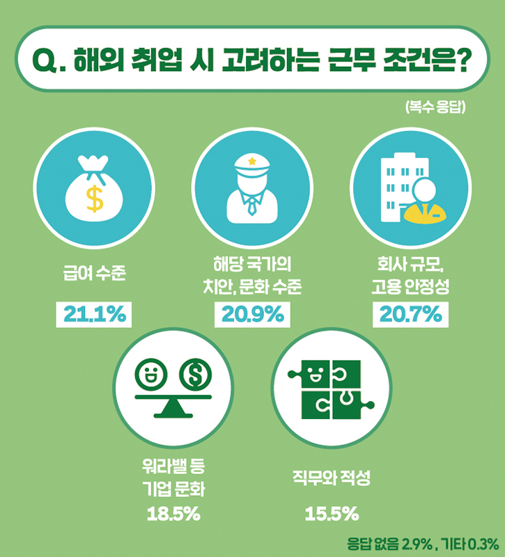 기타(2.3%) 의견으로는 ‘유학시절 인종차별을 심하게 경험했기 때문에’, ‘외국인 차별과 부당한 대우’ 등 인종차별과 외국인으로서 받는 대우에 대한 우려가 있었는데요. 또한, ‘해외 취업은 현지 채용이기에 해외 파견 주재원과의 대우가 다르다’, ‘한국도 힘든 상황이지만 막상 해외로 나간다고 해도 천국이 펼쳐지지는 않을 것 같다’ 등 현실적인 답변도 있었습니다.