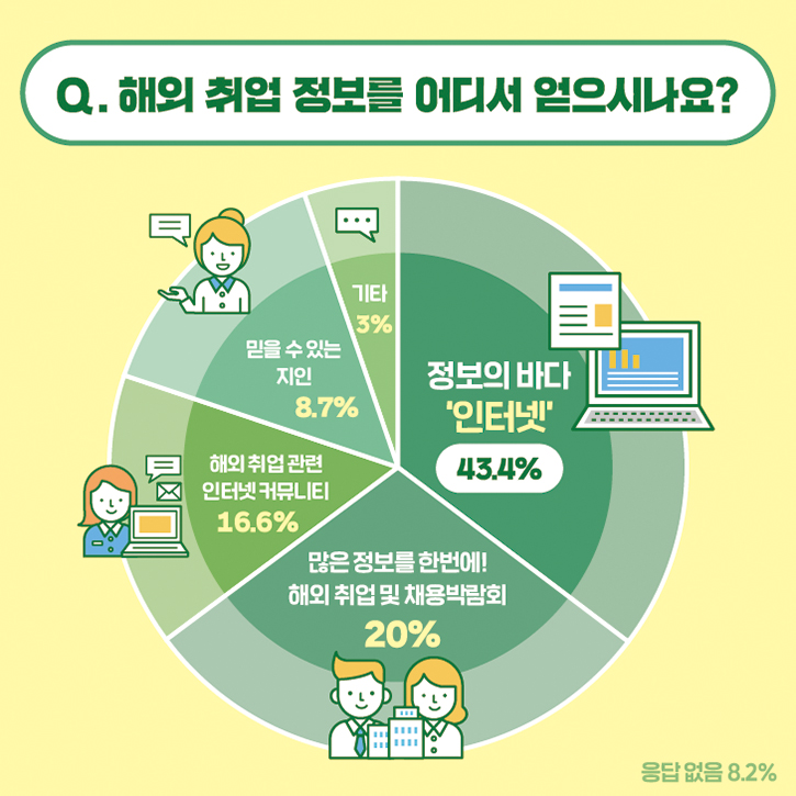 ‘해외 취업 정보를 어디서 얻으시나요?’라는 질문에 43.4%가 ‘인터넷’이라고 답했는데요. ‘해외 취업 및 채용박람회’(20%), ‘해외 취업 관련 인터넷 커뮤니티’(16.6%), '지인'(8.7%)이 그 뒤를 이었습니다. 온라인으로 해외 취업 정보를 얻는 비율이 오프라인보다 높은 것을 확인할 수 있네요!
