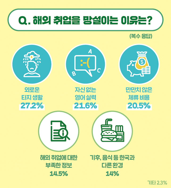 반대로 해외 취업을 망설이는 이유는 무엇일까요? 설문조사 결과, ‘외로운 타지 생활’이 27.2%로 1위를 차지했는데요. 사랑하는 가족, 친구, 연인과 멀리 떨어져 생활하는 게 쉬운 일은 아니죠. ‘자신 없는 영어실력’(21.6%), '만만치 않은 체류비용'(20.5%)도 상위권을 차지했습니다. 그 외 ‘해외 취업에 대한 부족한 정보’(14.5%), ‘기후, 음식 등 한국과 다른 환경’(14%) 은 10%대를 기록했습니다.
