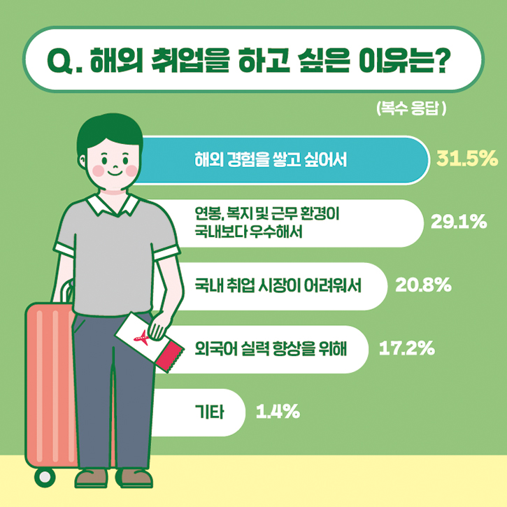 기타 의견(1.4%)으로는 ‘우물 안 개구리에서 탈출하고 싶어서’, ‘인생의 전환점으로 만들고 싶어서’ 등이 있었는데요. 넓은 세상을 경험하고 싶은 취준생들의 마음이 느껴졌습니다. 이외에 ‘그냥 해외에서 살아보고 싶어서', '외국 삶에 대한 동경’ 등 외국에 대한 좋은 이미지와 기억 때문에 해외 취업을 꿈꾸는 의견도 많았습니다.