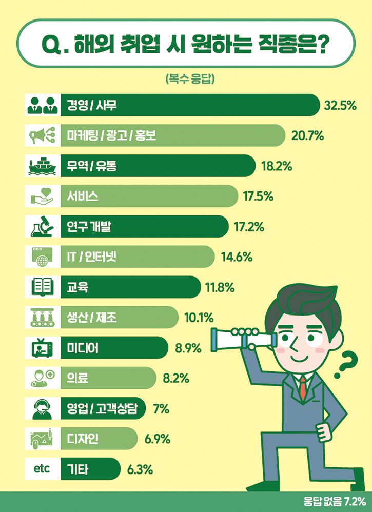 '해외 취업 시 원하는 직종은?' 질문에 '경영/사무'가 32.5%로 1위, '마케팅/광고/홍보'는 20.7%로 2위를 차지했는데요. '무역/ 유통'(18.2%), '서비스'(17.5%), '연구 개발'(17.2%), 'IT/인터넷'(14.6%), '교육'(11.8%), '생산/제조'(10.1%)는 10%대를 보였습니다.