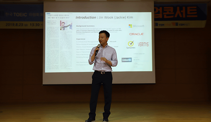 YBM 한국TOEIC위원회 이상봉 과장의 사회로 시작된 ‘2019 하반기 취업콘서트’는 1부와 2부로 나뉘어 오후 1시반부터 4시까지 진행됐습니다. 첫 번째 순서를 맡은 YBM 한국TOEIC위원회의 이상봉 과장은 취업 시장에서의 TOEIC의 위상과 활용 현황을 발표하면서 “2018년 채용 공고 910건을 분석한 결과 812건에서 일정 기준 이상의 점수를 요구하거나 참고 요소로 활용했다”고 밝혔는데요.