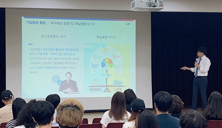 연세대에서 LS전선의 채용 방식을 소개한 LS전선 김영상 과장은 실무면접 예시를 소개하면서 두괄식 답변을 강조했는데요. 면접에서 자주 하는 실수와 자주 나오는 질문을 소개하고 과거 면접 경험을 이야기하면서 “자신감 있고 솔직하게 이야기하는 것이 중요하다”고 당부했습니다.