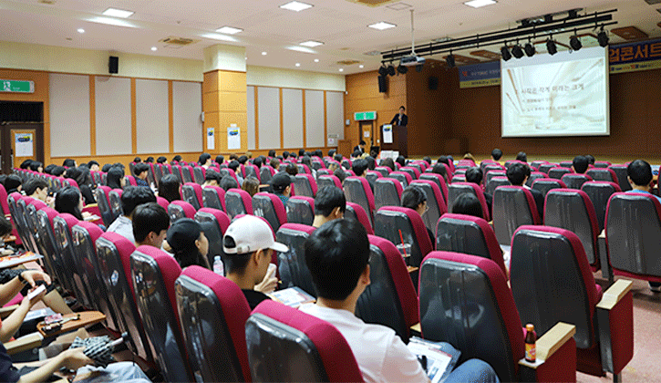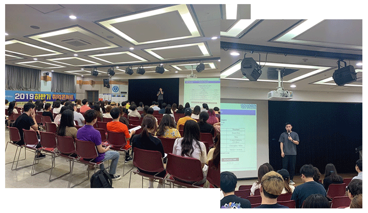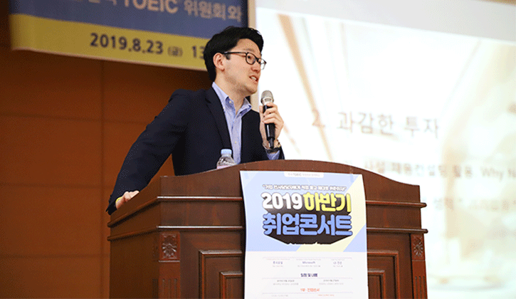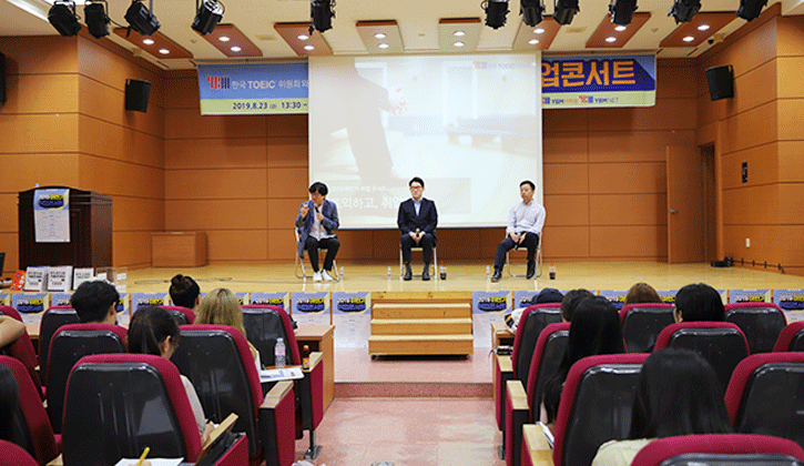 ‘2019 하반기 취업콘서트’가 지난 8월 23일 부산 동아대 김관음행홀과 26일 서울 연세대 공학관에서 각각 진행됐습니다. 2019년 하반기 채용 시즌을 맞아 YBM 한국TOEIC위원회에서 개최한 이번 행사에서는 토익스피킹에 대한 설명뿐 아니라 취업컨설턴트, 롯데 시그니엘, LS전선, 마이크로소프트 인사담당자들의 강연으로 알차게 구성되었는데요. 행사에 참석한 대학생 및 취업준비생 300여 명은 행사가 끝난 이후에도 질문하는 모습을 보일 정도로 취업에 대한 열의가 뜨거웠다고 합니다. 그럼 지금부터 그 현장을 함께 보시죠~!