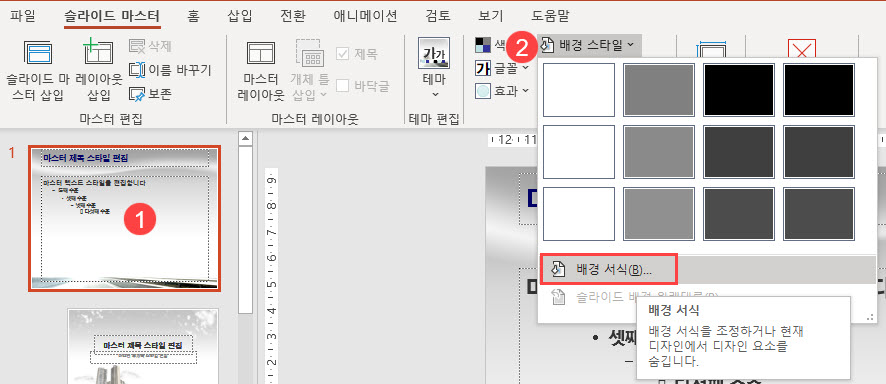 2. [슬라이드 마스터] > [배경] > [배경 스타일] > [배경 서식]을 클릭합니다.