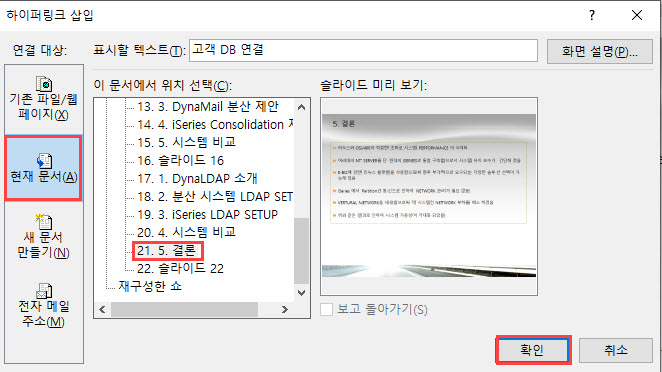 3. [하이퍼링크] > 연결 대상에서 [현재 문서] 선택 > 21번 슬라이드 선택합니다.
