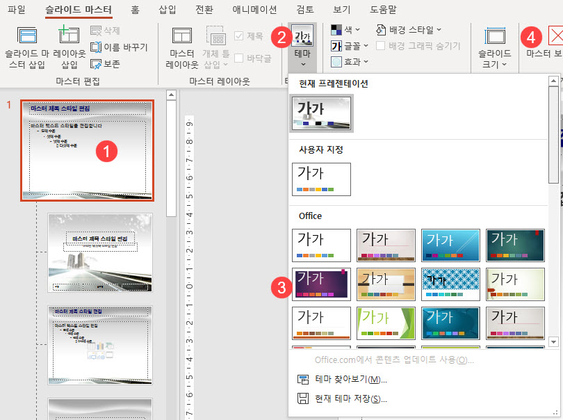 2. [슬라이드 마스터] > [테마 편집] > [테마]를 클릭합니다.
