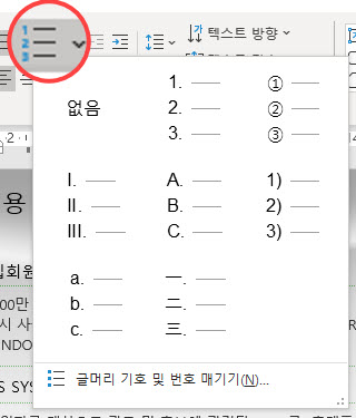 3. 원하는 글머리 기호 및 번호 매기기 종류를 선택합니다.