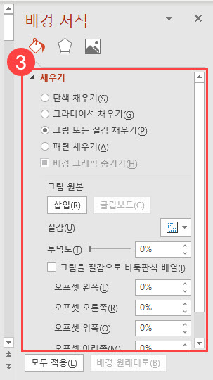3. [채우기] 옵션 항목에서 원하는 옵션을 선택하고 배경을 변경합니다.