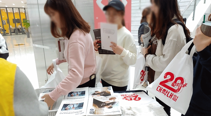 이번에도 역시! 많은 기업들이 '대학내일 취업특집호 샘플링 행사'에 참여하였습니다. 대학내일 취업특집호와 기업들이 제공한 샘플링을 받을 수 있어 학생들에게 뜨거운 호응을 얻었는데요.