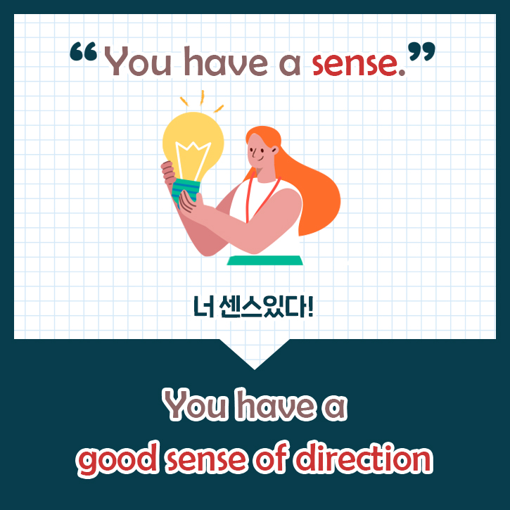 말하지 않아도 상황에 맞게 알아서 척척! 해내는 사람을 보고 ‘너 완전 센스있다~’라는 칭찬을 많이들 하죠? 한국어를 직역해서 ‘You have a sense!’라고 하면 원어민들이 고개를 갸웃할지도 모릅니다. ‘sense’는 ‘감각’이라는 뜻으로 시각, 미각, 후각, 촉각, 청각, 오감을 모두 포함하는데요. 그러므로 어떤 부분에 감각이 있다고 말하는 건지 구체적으로 말해줘야 합니다. ‘You have a good sense of humour’(너 유머감각 있다), ‘You have a good sense of direction’(너 길 찾는 감각이 있다) 이렇게요~!
