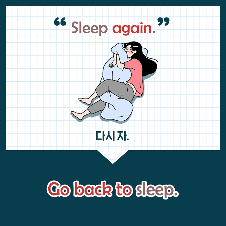 ‘다시 자~’라고 말하고 싶을 때 영어로 직역하여 ‘Sleep again’이라고 쓰는 분들이 많으신데요. 하지만! 원어민들은 이 표현을 쓰지 않기 때문에 어색하게 느낄 수 있습니다. 번역기를 돌린 것 같은 부자연스러운 말투라고 느끼는데요. 원어민들은 '다시 자~'를 영어로 ‘Go back to sleep’라고 합니다. 조금 더 부드럽게 전달하고 싶다면 앞 뒤에 'please~'를 붙이면 된답니다!