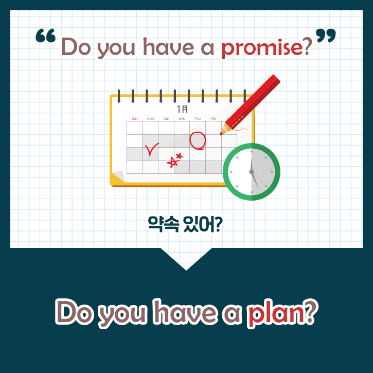 여기서 하나 더! 비슷한 단어로 인식하고 있는 ‘appointment’는 어떨까요? ‘appointment’는 의사와의 약속, 담당 교수님과의 약속 등 형식적인 어감의 약속을 말하는데요. 우리가 생각하는 가벼운 약속을 의미할 때는 ‘plan’이라는 단어를 주로 씁니다. 친구 사이에 약속을 잡을 때 서로 오해가 없도록 공적이고 무거운 단어 'promise','appointment'보다는 'plan'을 활용하여 'Do you have a plan?'으로 바꿔 사용해보세요~