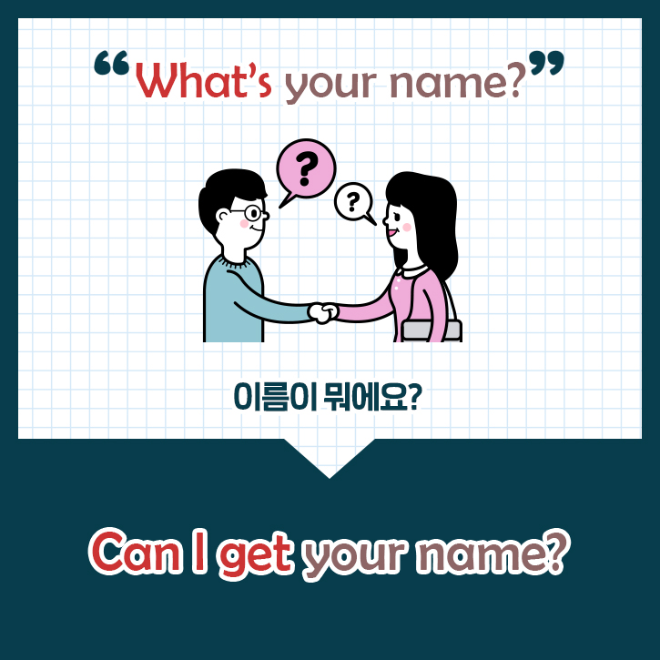 우리도 업무상의 이유로 상대방의 이름을 물어볼 때 '이름이 뭐예요?'라고 직접적으로 묻기보다는 약간 거리를 두고 '이름이 어떻게 되세요?', '성함이 어떻게 되세요?'라고 묻는 것과 같은 맥락이라고 볼 수 있는데요. 업무 할 때는 ‘Can I get your name?’, 'May I have your name?' 등의 표현으로 이름을 정중하게 묻는 센스, 잊지 마세요~