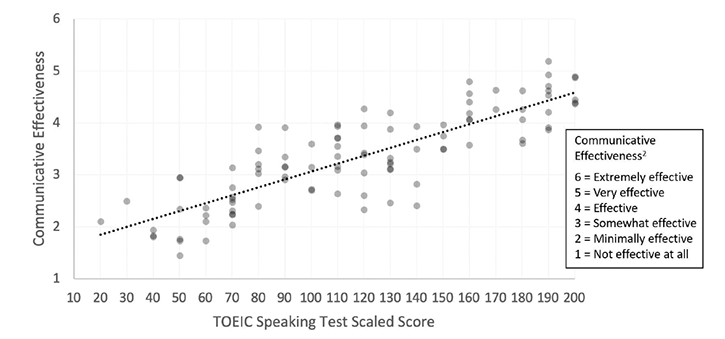 표에서 보는 바와 같이 글로벌 업무 환경에서 근무하는 전문가들의 커뮤니케이션 효율성 결과와 토익스피킹 시험의 환산점수 간의 상관관계가 매우 높게 나타났습니다. 커뮤니케이션 효율성에서 높은 점수를 기록한 참가자의 토익스피킹 환산점수도 함께 높은 점수를 기록한다는 것을 확인할 수 있습니다. 그러므로 '토익스피킹 점수와 실제 영어 말하기 실력은 무관하지 않다'라고 말할 수 있겠죠?