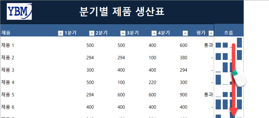 엑셀에서 챠트 기능은 시트 전체(혹은 일부)에 걸쳐 데이터를 시각화하는 도구였습니다. 특정 셀 또는 특정 셀 범위 데이터의 추세를 셀 안에 시각화하는 도구가 바로 스파크라인 입니다. 다른 말로는 ‘미니 차트’라고 부르기도 합니다. [분기별 제품 생산 표]에서 각 제품별 1분기부터 4분기까지의 데이터로 스파크 라인을 만들어 보겠습니다.