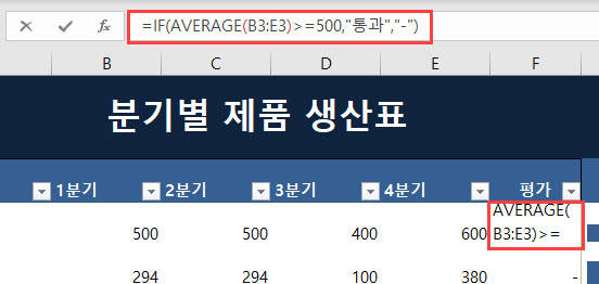 [분기별 제품 생산표]에서 모든 분기 동안 평균 제품 생산량이 500개 이상일 경우, “통과”라고 표시하고 그렇지 않으면 “-“으로 표시하는 IF 함수 식을 작성해 보겠습니다.