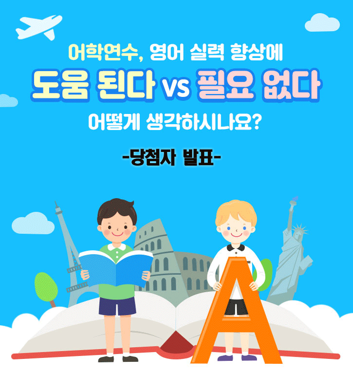 | [설문 이벤트] 어학연수, 영어 실력 향상에 "도움 된다" vs "필요없다" 어떻게 생각하시나요? (0) | 2019.10.08 |