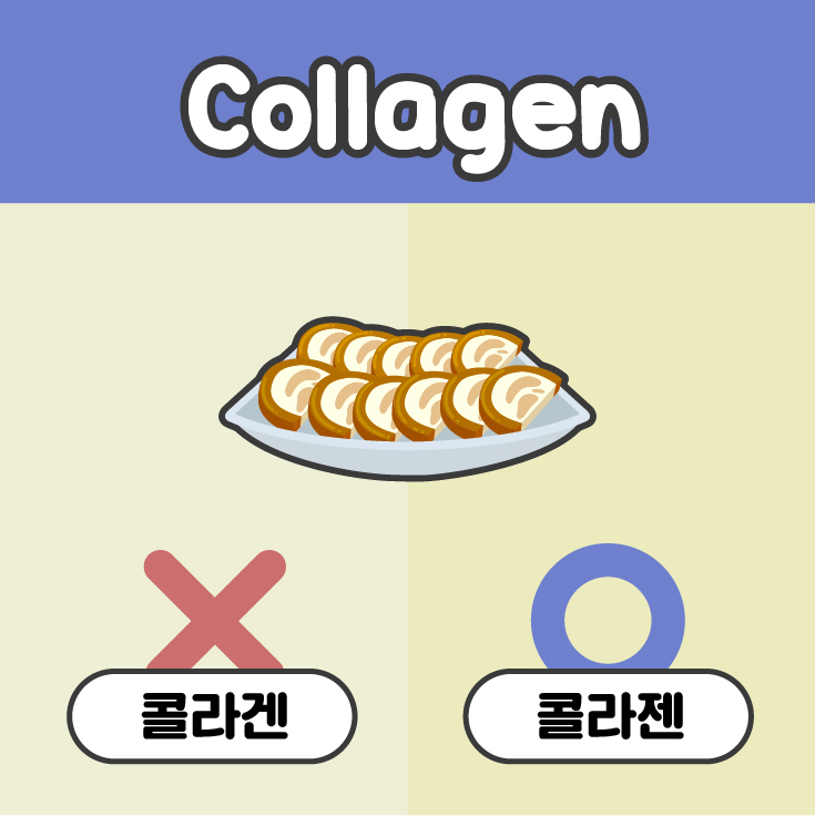 동물의 피부와 뼈, 연골, 머리카락 등에 존재하는 단백질 성분을 '콜라겐'이라고 합니다. 피부 미용에 탁월하다고 알려진 만큼 시중에서 '콜라겐' 화장품을 쉽게 찾아볼 수 있는데요. 또한, 족발의 효능을 이야기 할 때 ‘높은 콜라겐 함유량’이 빠지지 않고 나옵니다. 그렇다면 'Collagen'을 영어로 어떻게 발음할까요? 실제 영어 발음은 ‘Collagen’의 ‘g’를 ‘z’로 발음해서 [콜라젠]이라고 읽는다고 하네요!