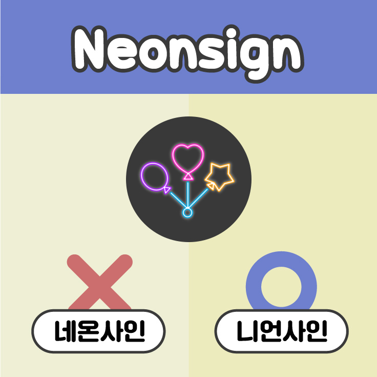 영어 발음도 [네온사인]이라고 생각하셨겠지만! 'Neonsign'의 'e'가 [이]로 발음되어 [니언사인]이라고 읽는데요. 한 가지 발음 팁을 더 드리자면 [사인] 부분은 외래어로 읽을 때보다 더 짧게 발음해주시면 된답니다~