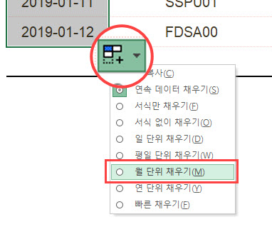 3. 마지막 셀 오른쪽 하단에 표시된 ‘채우기 옵션’을 클릭하고 단축메뉴에서 ‘월 단위 채우기’ 항목을 체크합니다.