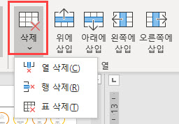 3. 행 또는 열을 삭제하려면 [행 및 열]에서 [삭제]를 클릭하여 커서를 기준으로 [열 삭제] 나 [행 삭제]를 선택합니다.