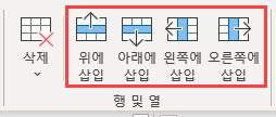 2. [레이아웃] > [행 및 열] > 커서가 위치한 곳을 기준으로 어느 방향에 행 또는 열을 삽입할 것인지 선택합니다.