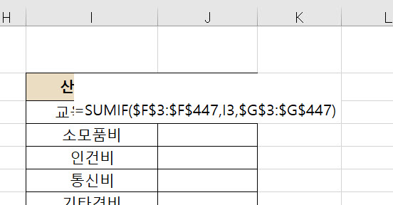 7. 전체 함수 식 =SUMIF($F$3:$F$447, I3,$G$3:$G$447) 이 완성됩니다.