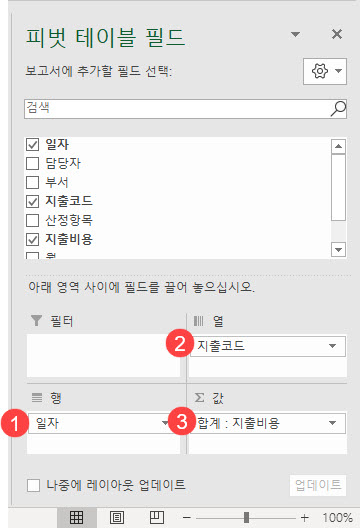 6. 워크시트 오른쪽에 표시된 ‘피벗 테이블 필드’ 창에서 [지출 코드] 필드를 열 영역으로, [일자] 필드를 행 영역으로, [지출비용] 필드를 값 영역으로 드래그하여 배치합니다.