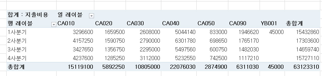 피벗 테이블의 데이터를 다양한 기준으로 그룹화하여 데이터를 한눈에 알아보기 쉽게 표시할 수 있습니다. 이전에 만든 일자별 지출 코드에 따른 지출비용의 합계를 표시한 피벗 테이블을 일자별이 아닌 분기별로 행 레이블을 다시 그룹화하려면