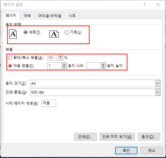 페이지 설정 기능을 사용하면 페이지 방향, 페이지 여백, 용지 설정, 인쇄 품질, 머리글 및 바닥글 편집, 인쇄 영역 설정 등을 사용자가 지정할 수 있습니다. [페이지] 탭에서 용지 방향 및 배율을 조정하려면