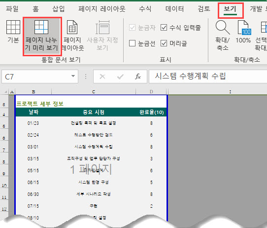 4. 인쇄 영역을 확인하려면 [보기]탭 메뉴의 [페이지 나누기 미리보기]를 통해서 확인할 수 있습니다.