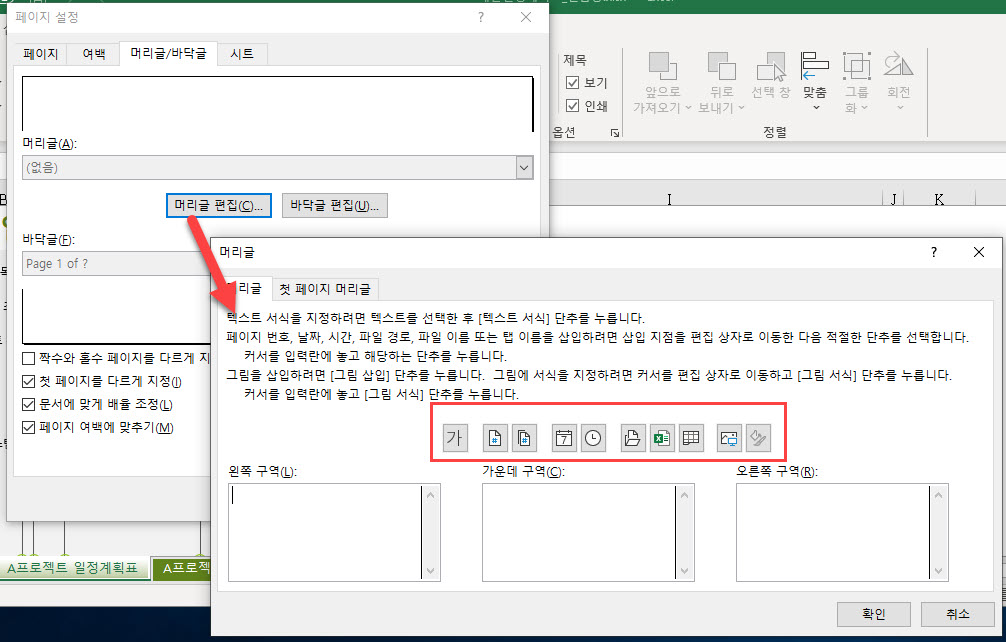 2. 페이지 번호, 날짜, 시트 이름, 그림 등 원하는 항목을 선택하여 삽입합니다.