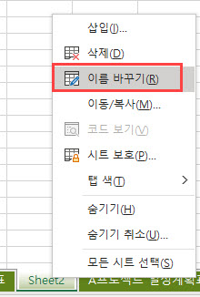 1. 이름을 변경 할 시트 탭에 마우스를 가져가서 오른쪽 버튼을 클릭합니다.