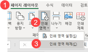 1. [페이지 레이아웃] 탭 > [페이지 설정] 그룹 > [인쇄 영역] > [인쇄 영역 해제]를 선택합니다.