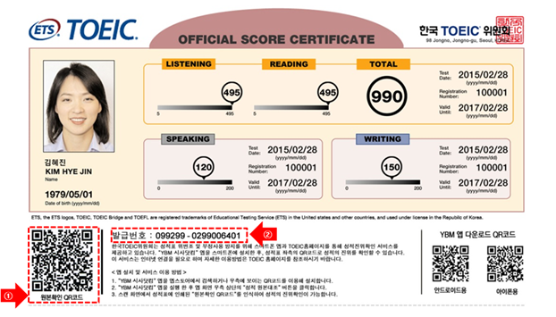 YBM 한국TOEIC위원회에서는 이러한 피해를 막고, 성적표 위/변조를 차단하기 위해 현재 시행 중인 어학시험 성적의 진위 확인 서비스를 제공 중인데요. TOEIC뿐만 아니라 TOEIC Speaking, JPT(일본어능력평가시험), SJPT(일본어말하기시험), TSC(중국어말하기시험) 성적표의 진위를 '원본 확인 QR 코드'와 '발급 번호'로 확인할 수 있습니다. '원본 확인 QR 코드'는 YBM 애플리케이션에서 , '발급 번호'로는 YBM 홈페이지를 통해 가능하다는 사실 꼭 알아두세요!
