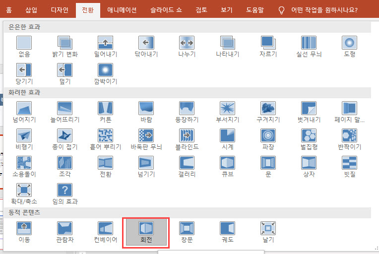 2. [전환] > [슬라이드 화면 전환] > [자세히]를 클릭 > 전환 갤러리에서 [동적 콘텐츠] 항목의 [회전] 효과를 선택합니다.
