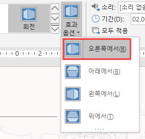 [슬라이드 화면 전환] > [효과 옵션] > [오른쪽에서]를 선택합니다.