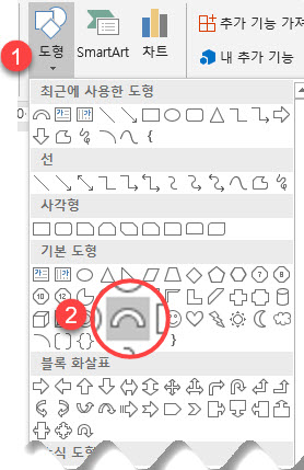 2. [기본 도형] 카테고리의 ‘막힌 원호’ 도형을 선택한 후 드래그합니다.