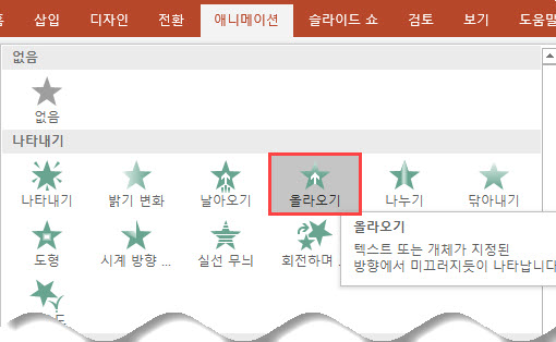2. [애니메이션] > [애니메이션] > [나타내기] > [올라오기]를 선택합니다.