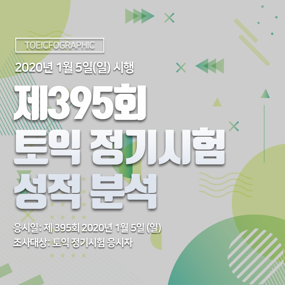 지난 1월 5일에 치러진 2020년 첫 토익 정기시험! '제395회 토익 정기시험 성적'을 공개합니다. 개인 성적 확인은 마치셨나요? 개인 성적을 확인하셨다면 전체 평균에서 내 위치가 어디쯤에 있는지 확인해 볼 차례! '제395회 토익 정기시험 성적 분석'을 인포그래픽으로 함께 살펴보겠습니다.
