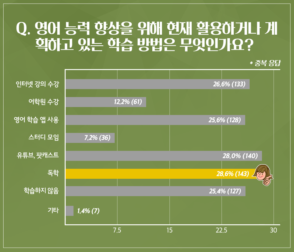 영어 능력 향상을 위해 노력하는 직장인들! 과연 어떤 학습법을 선호할까요? 가장 높은 응답률을 보인 학습법은 '독학'입니다. 28.6%(143명)이 응답했는데요. 최근 학습 관련 다양한 플랫폼이 등장함에 따라 '유튜브, 팟캐스트 활용' 등이 28%(140명)로 '독학'의 뒤를 이었고, 스마트폰 등을 이용한 '영어 학습 어플'을 사용하겠다는 의견도 있었습니다.
