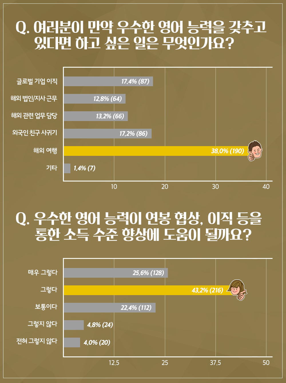 만약 여러분에게 뛰어난 '영어 능력'이 있다면 무얼 가장 하고 싶으신가요? 이 질문에 대한 답으로 '해외여행'을 선택한 직장인이 가장 많았습니다. 38%에 해당하는 190명이 선택했는데요. 이밖에 '글로벌 기업으로 이직', '해외 법인/지사에서의 근무', '해외 관련 업무 담당' 등이 고르게 나타났습니다.