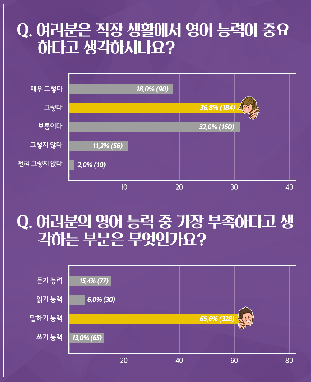 직장인 500명에게 물은 '영어 능력' 인식조사 결과를 살펴봤는데요. 도움이 되셨나요? 이번 설문조사를 실시하면서 토익, 토익스피킹이 단순히 취업을 위한 '공인 어학성적'에서 그치는 것이 아니라 장기적인 관점에서 꼭 필요한 스펙임을 알 수 있었습니다. 특히 비즈니스 커뮤니케이션을 다루는 토익스피킹은 학습의 과정 자체가 직장인의 '영어 능력' 상승을 위한 과정이라 해도 과언이 아닐 듯합니다.